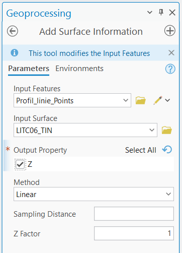 2. Nově vytvořené bodové vrstvě přiřadíme výšky z TIN/LAS/DMR funkcí Add Surface Information. Na obrázku níže je výška extrahována z TIN.