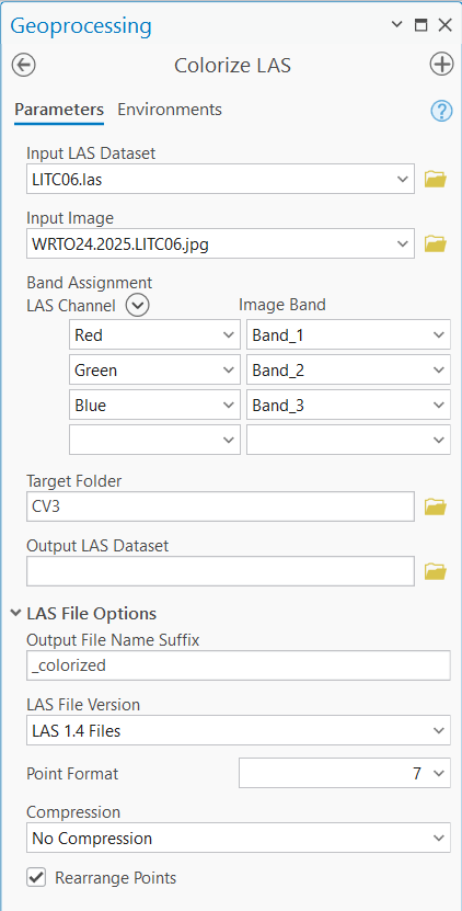 2. Po stažení ortofota vyhledáme v Geoprocessingu funkci Colorize LAS. Jako Input Dataset určíme mračno bodů. Do parametru Input Image vložíme vybrané ortofoto a zkontrolujeme přiřazení pásem snímku.