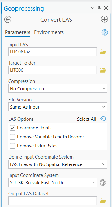 1. Jestliže získáme data ve formátu ZLAS nebo LAZ, je nutné mračno bodů v ArcGIS Pro konvertovat do formátu LAS pomocí funkce Convert LAS. Takto převedná data již dokáže ArcGIS načíst.