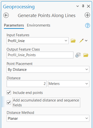 1. Vytvoříme linii a necháme podél linie vygenerovat body ve zvolené vzdálenosti funkcí Generate Points Along Lines.