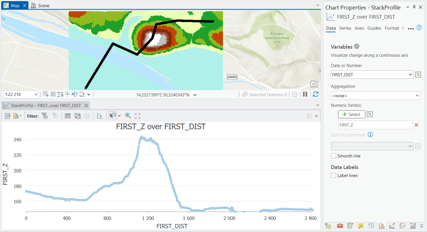2. Následně je možné vygenerovat liniový graf profilu. Jako Date or Number se nastaví pole FIRST_DIST a Numeric Field(s) se nastaví FIRST_Z. Obdobně lze generovat graf v úloze Odečet výšek z digitálního modelu terénu.