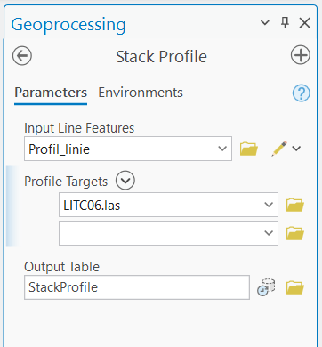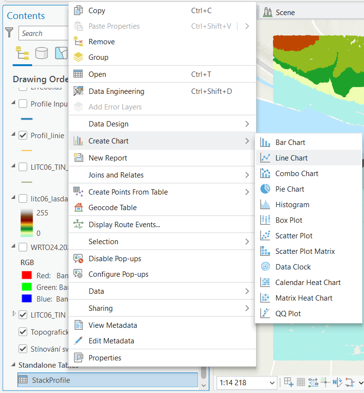 1. Po nakreslení linie profilu se funkcí Stack Profile vygeneruje tabulka se atributem vzdálenosti od počátku a atributem výšky.