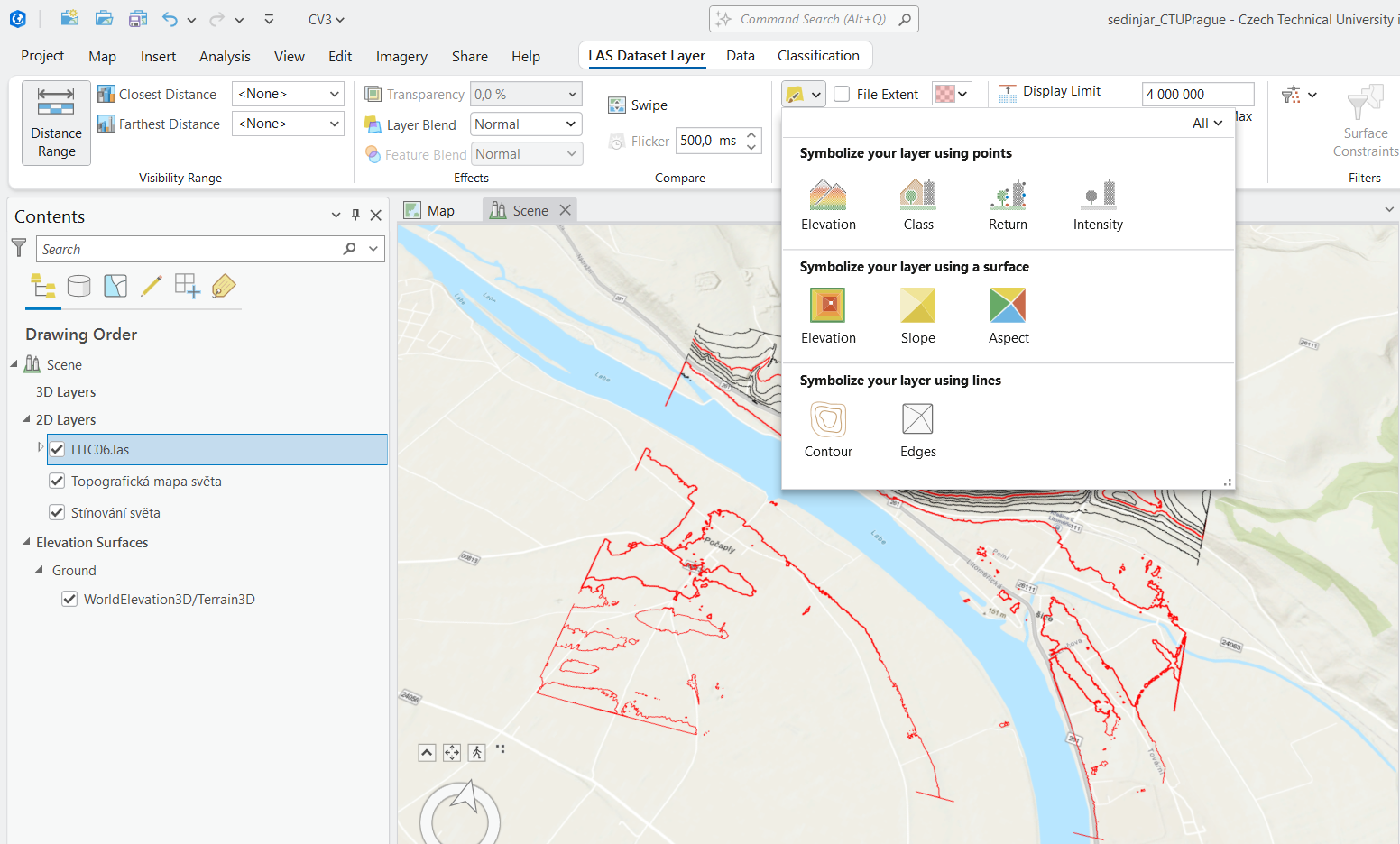 2. Různé možnosti vizualizace LAS jsou dostupné po vybrání vrstvy mračna bodů v záložce LAS Dataset Layer. Pod ikonou Symbology