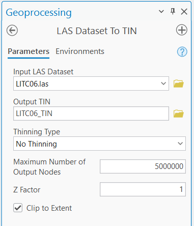 1. Nejprve vytvoříme TIN z dat LiDARového skenování. V ArcGISu Pro je k tomu určena funkce LAS Dataset To TIN.