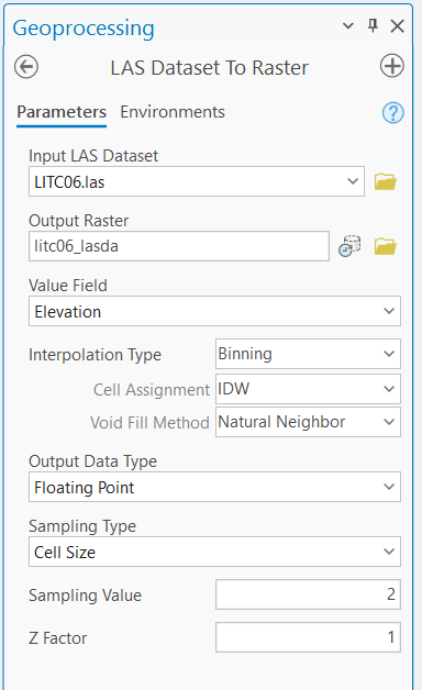 2. Vstupními daty Input LAS Dataset jsou lasetová data ve formátu LAS. Value Field určuje hodnotu, na základě které se vypočte výstupní rastr. Jeho umístění určímě v parametru Output Raster.