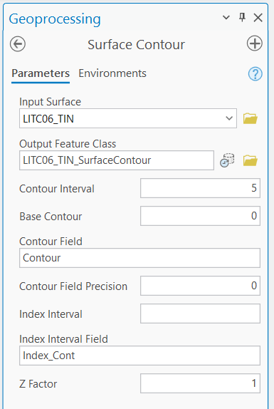2. Následně je možné pževést TIN do vrstevnic funkcí Surface Contour. Funkce také umožňuje přímý převod dat LAS na vrstevnice.