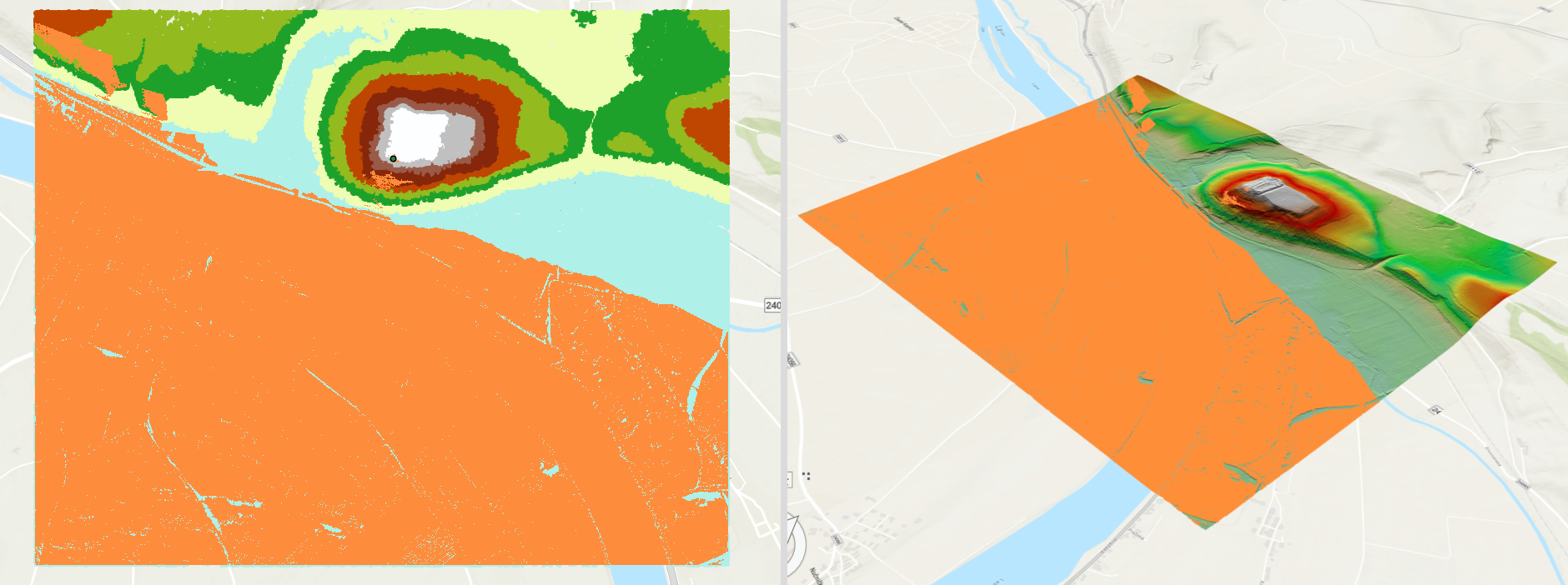 3. Výše zmíněné možnosti symbologie se dělí na tři typy: Vizualizace dle bodů, terénem či liniově. Bodové vizualizace nabízejí zobrazení barvy mračna bodů na základě jeho nadmořské výšky (Elevation) nebo klasifikace dat (Class). Mračno bodů je dále možné symbolizovat jako terén, přičemž barva může být určená nadmořskou výškou (Elevation), sklonem terénu (Slope) nebo sklonem ke světové straně (Aspect). Třetí možnost, vizualizace vrstvy pomocí linií, nabízí zobrazení vrstevnic (Contour) a hran (Edges).