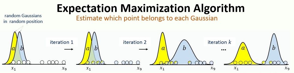 - Určení počáteční střední hodnoty a rozptylu pro každý shluk (náhodně nebo pomocí K-Means)