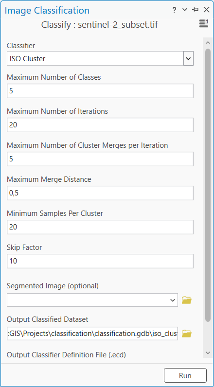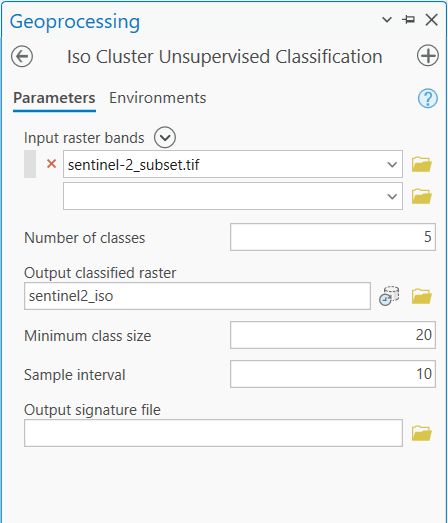 Zde již ale musíme vědět, který z nabízených klasifikátorů patří mezi klasifikátory neřízené klasifikace. Tím je v ArcGIS Pro pouze klasifikátor ISO Cluster. Dalé je zde potřeba vyplnit několik parametrů. Jsou jimi následující: