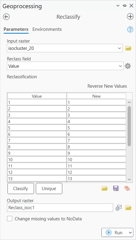 Dalším krokem bude vytvořené spektrální třídy seskupit do tříd informačních. Na to se hodí funkce Reclassify, kde nastavíme stávajícím třídám nové hodnoty. Abychom se ale vyznaly v tom, co jaká třídy v klasifikovaném rastru představuje, tak si pomůžeme "jakýmsi maskováním". Vždy si tedy zobrazíme jen jednu konkrétní třídu. To uděláme tak, že si v symbologii klasifikovaného rastru nastavíme všechny třídy taky, aby měly No color, kromě jedné zrovna zkoumané třídy. D9ky tomu pak přehledně vidíme, co daná třída pokrývá, a co tedy ve skutečnosti představuje. Poté se vrátíme do nástroje Reclassify a dané třídě přiřadíme novou hodnotu (co nová hodnota představuje si buď poznamenám někam bokem nebo si to zapamatuji).