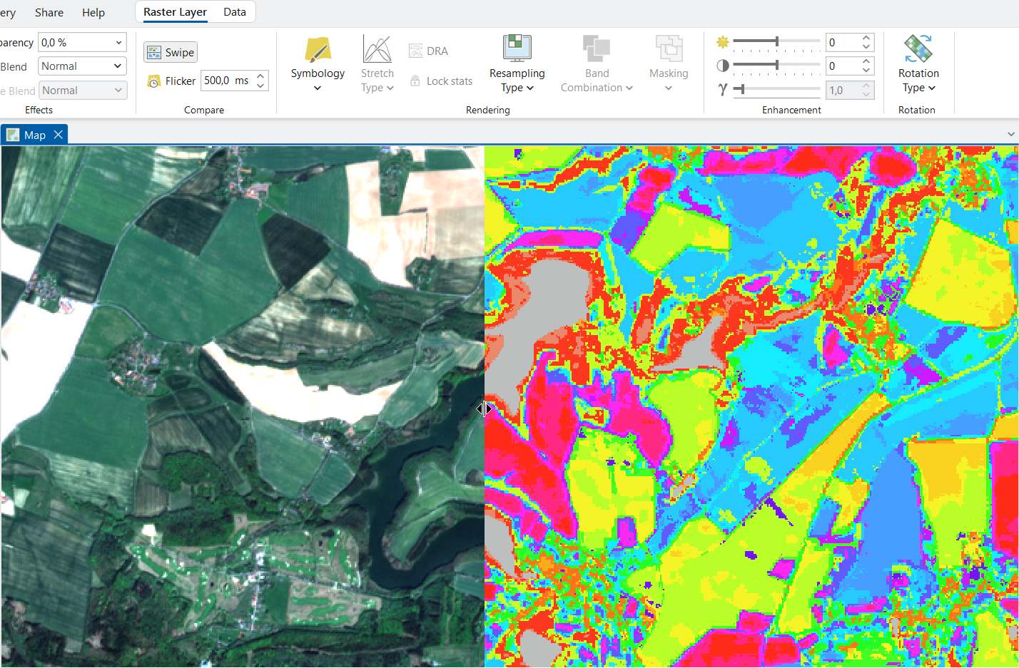 Dále můžeme výsledky porovnat se skutečností. K tomu můžeme využít například nástroj Swipe nacházející se v menu Raster Layer.