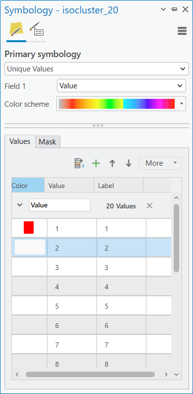 Když si tuto vrstvu poté zobrazíme v mapovém okně, zobrazuje se pouze v odstínech šedi. Z klasifikovaného produktu si ale můžeme uložit barevnou paletu a nahrát jí do klasifikované vrstvy, kterou jsme si vytvořili v původním produktu. Nicméně i tak bychom doporučovali využít tuto vrstvu pouze pro maskování a barevné úpravy provádět v klasifikovaném produktu, u kterého se tabulka s hodnotami a barvami jednotlivých spektrálních tříd zobrazuje lépe a přehledněji. Masku pro konkrétní spektrální třídu vytvoříme v Mask Manager pomocí funkce Creates a new mask based on a logical band maths expression.