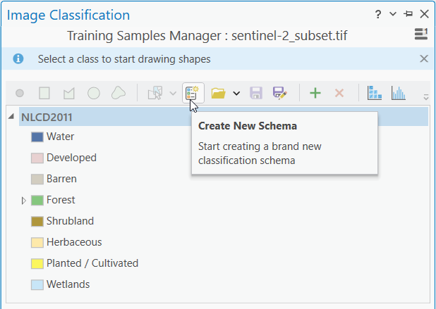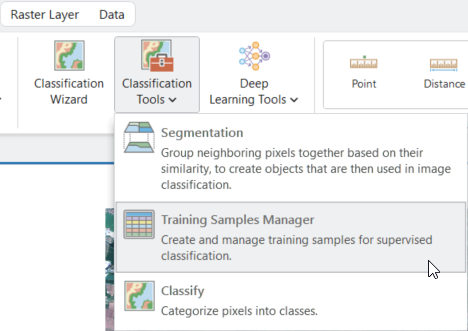 Trénovací plochy v ArcGIS Pro budeme vytvářet pomocí nástroje Imagery → Classification Tools → Training Samples Manager.
