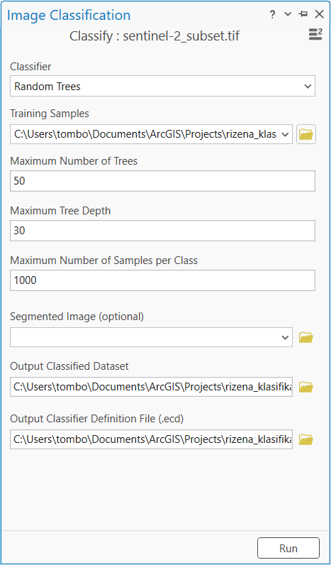 Když máme naklikáno dostatečné množství trénovacích ploch, můžeme přejít ke klasifikaci. Klasifikátory najdeme v Imagery → Classification Tools → Classify. My si vyzkoušíme například klasifikátor Random Trees (správně je to Random Forest). Vložíme naše vytvořené trénovací plochy a nastavíme příslušné parametry, tj. počet stromů a maximální hloubku.