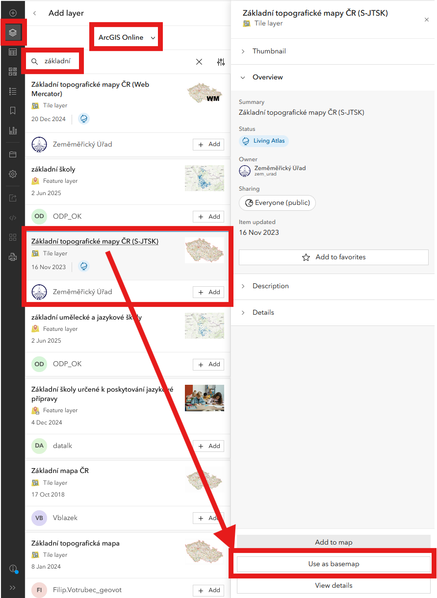 Pro všechny mapy ve webové aplikaci použijte podkladovou mapu s názvem Základní topografické mapy ČR (S-JTSK), která je k dispozici na ArcGIS Online od uživatele Zeměměřický úřad. Nastavením podkladové mapy v systému S-JTSK se eliminuje posun některých připojených vrstev (např. Stavebních objektů). Podkladové mapě lze nastavit průhlednost pro lepší čitelnost ostatních mapových vrstev.