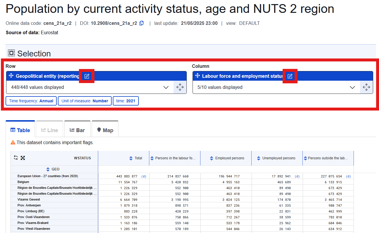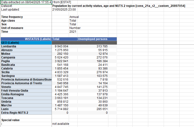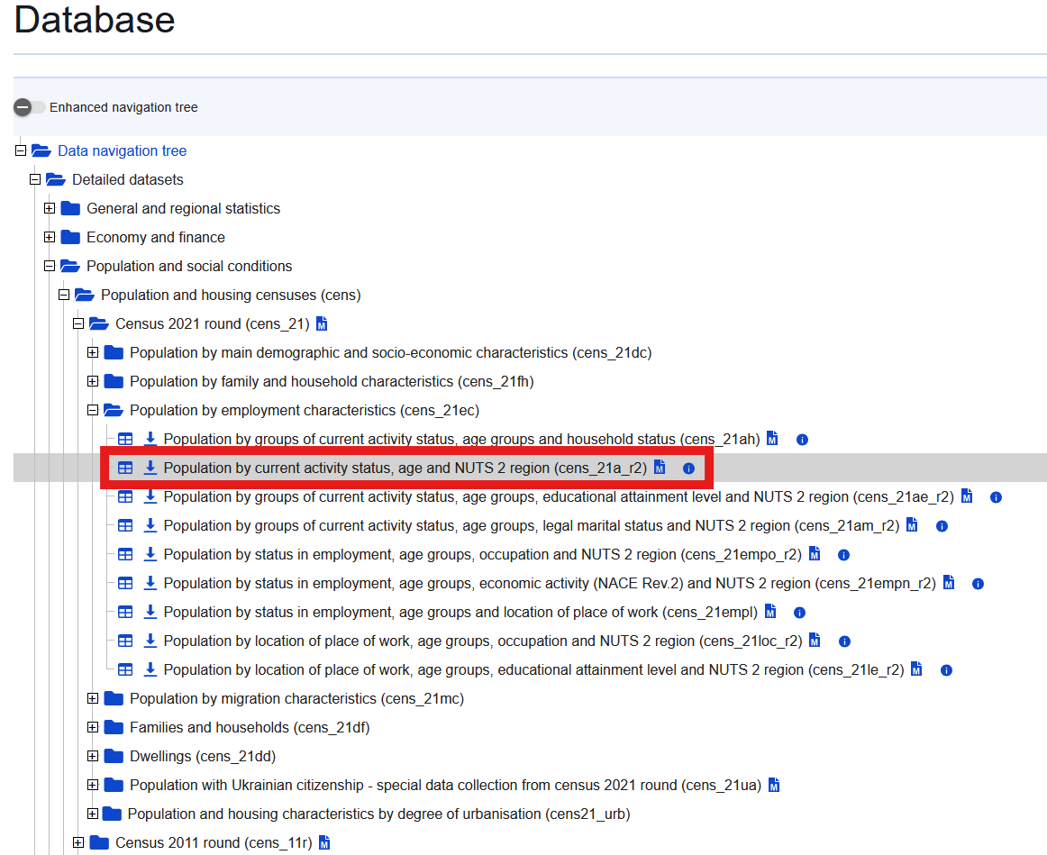 Ze statistického portálu Eurostat si stáhneme data o nezaměstnanosti za jednotlivé regiony NUTS2. V kompletní databázi je však musíme nejdříve najít. Nacházejí se v sekci Population and social conditions -> Population and housing censuses -> Census 2021 round -> Population by employment characteristics. Jedná se o tabulku s názvem Population by current activity status, age and NUTS 2 region. Tabulku otevřeme kliknutím na ikonu tabulky. Před stažením si data profiltrujeme.