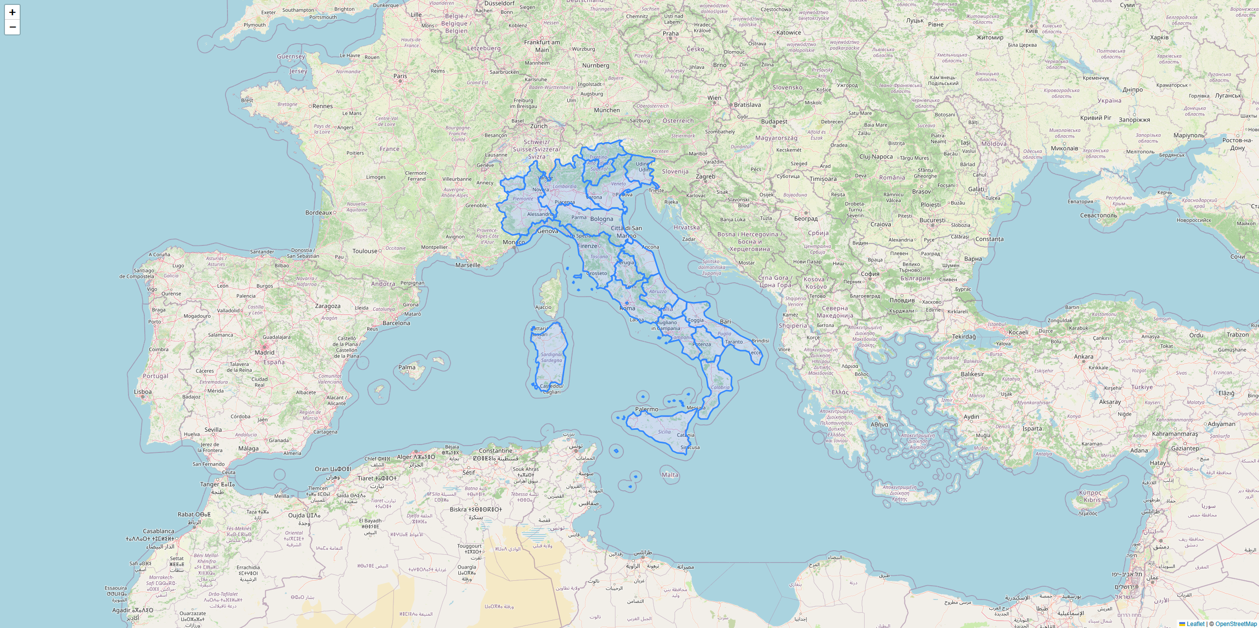 Cílem tohoto cvičení je tvorba mapové aplikace vytvořené pomocí knihovny Leaflet, ve které budou zobrazeny vybrané vrstvy pro určitou zemi Evropské unie. V tomto příkladu budeme pracovat s daty pro Itálii, nicméně postup je obdobný pro další členské státy.