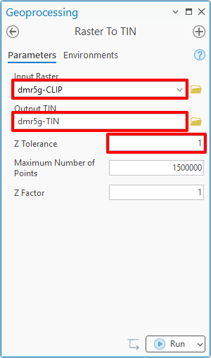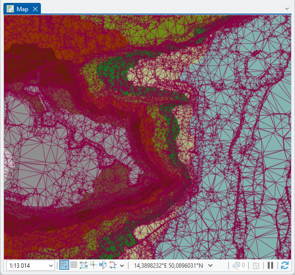Konverzi je nutné provést přes tzv. TIN (triangulated irregular network = nepravidelná trojúhelnková síť). Jedná se o speciální datový formát, nejde uložit do geodatabáze a v tomto postupu se jedná pouze o meziprodukt.