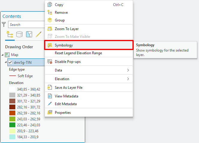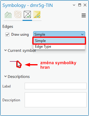 TIN se automaticky zobrazí s výchozí symbolikou, pro zobrazení jednotlivých trojúhelníků je nutné v panelu symboliky přepnout zobrazení hran (viz obrázek).