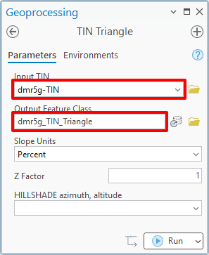Protože neexistuje nástroj pro přímou konverzi z formátu TIN do CAD, je nutné TIN převést na běžnou polygonovou třídu prvků (Feature Class). Nástroj se jmenuje TIN Triangle.