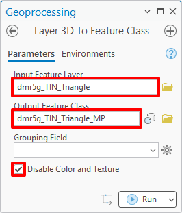 V této fázi jsou trojúhelníky v podobě polygonů – ty se ale v CADu zobrazí jako uzavřené linie – ne jako plochy. Proto je ještě nutné provést konverzi do Multipatch geometrie – nástrojem Layer 3D To Feature Class. Nástroj vyžaduje jako vstup vrstvu přidanou v mapě.