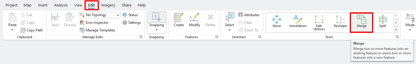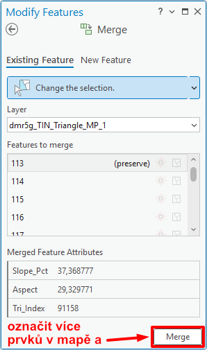 Při exportu do CADu v této podobě by bylo vše v pořádku, ale každý trojúhelník by byl samostatným objektem, což nemusí každému vyhovovat (velké množství objektů by také mohlo způsobit problémy s výkonem – pomalé prohlížení, zasekávání apod.). Lze to řešit spojením trojúhelníků to jednoho objektu (lze pouze u Multipatch geometrie) editačním nástrojem Merge – nejedná se o geoprocessingový nástroj Merge, ale o nástroj editační (viz obrázek).